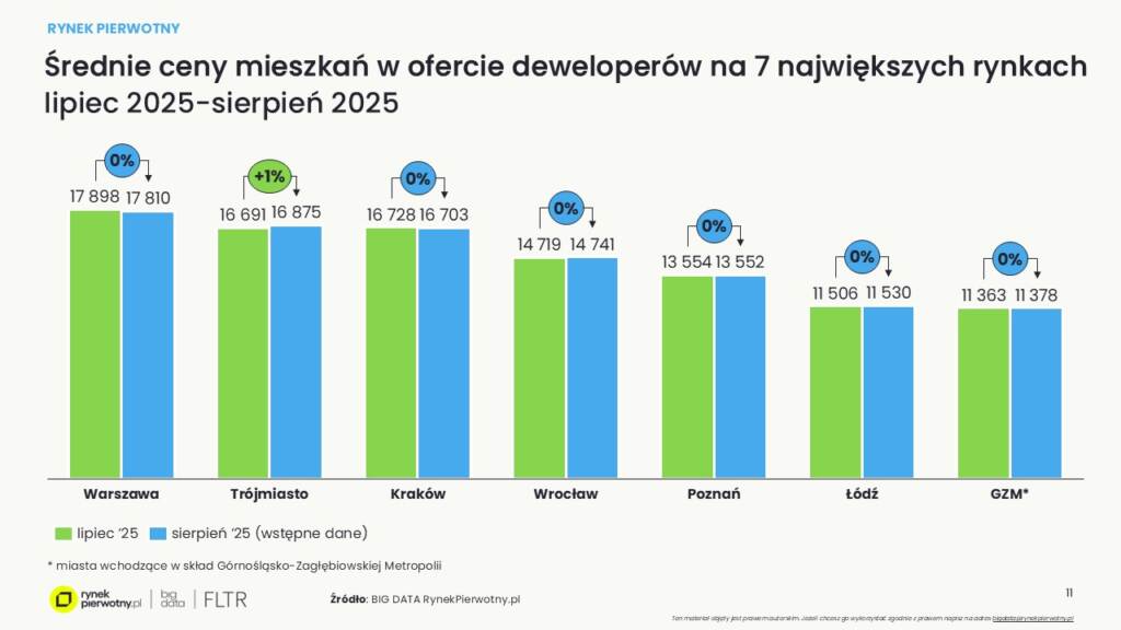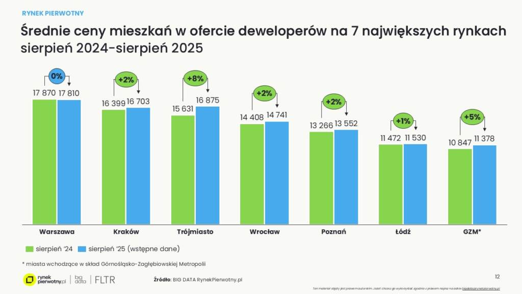 Po ośmiu miesiącach o tytuł najbardziej stabilnej cenowo metropolii w 2025 r. z Warszawą rywalizuje Łódź. Zmiana średniej ceny metra kwadratowego nowych mieszkań w okresie 12 miesięcy wynosiła tu w sierpniu tylko 1%. Z kolei w Krakowie, Wrocławiu i Poznaniu było to 2%, a w Górnośląsko-Zagłębiowskiej Metropolii – 5%.