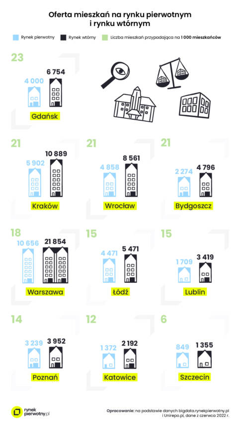 Kupując wymarzone M chcemy mieć jak największy wybór. Oczekujemy dużej bazy nieruchomości i możliwości “przebierania” w ofertach, aby finalnie zakupić to mieszkanie, które najlepiej odpowie na nasze potrzeby i oczekiwania. Czy tak jest w rzeczywistości? Chcąc odpowiedzieć na to pytanie portal RynekPierwotny.pl policzył, ile mieszkań będących w sprzedaży w czerwcu 2022 r. przypadało na tysiąc mieszkańców w poszczególnych miastach.