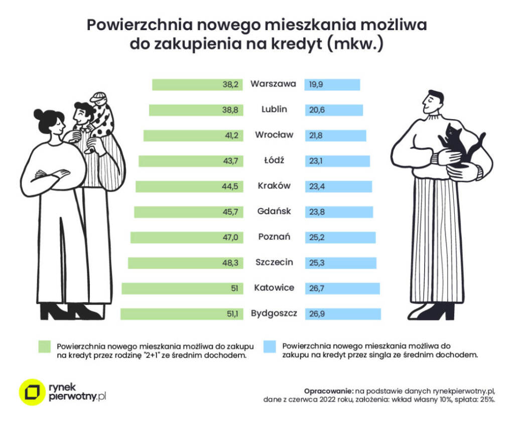 Z przeprowadzonych obliczeń wynika, że nowy metraż możliwy do zakupu przez średnio zarabiającego singla w połowie 2022 roku wynosił od 19,9 mkw. (Warszawa) do 26,9 mkw. (Bydgoszcz). W przypadku rodziny „2+1” sytuacja wygląda podobnie. Najmniejszy metraż kupimy w Warszawie (38,2 mkw.), największy w Bydgoszczy (51,1 mkw.)