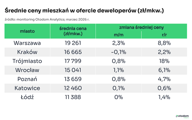 – W marcu średnie ceny ofertowe mieszkań wzrosły w czterech z siedmiu analizowanych miast. O ile w Warszawie i Trójmieście takie zmiany widzieliśmy już w kilku poprzednich miesiącach, o tyle na rynkach poznańskim i wrocławskim to w kilku ostatnich miesiącach nowe zjawisko – dodaje Katarzyna Kuniewicz.