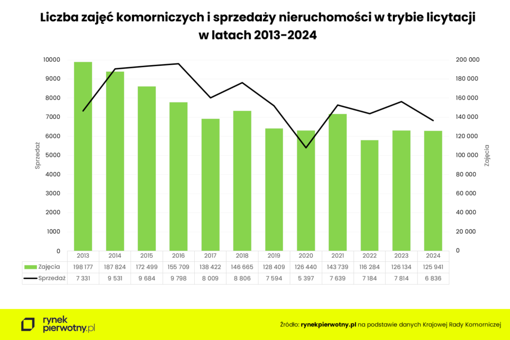 Trend zajęć komorniczych nieruchomości ma w ciągu minionych 12 lat wyraźny trend spadkowy z maksimum w roku 2013 na poziomie ponad 198 tys. do niespełna 126 tys. w roku 2024. To regres o znaczące 36 proc.