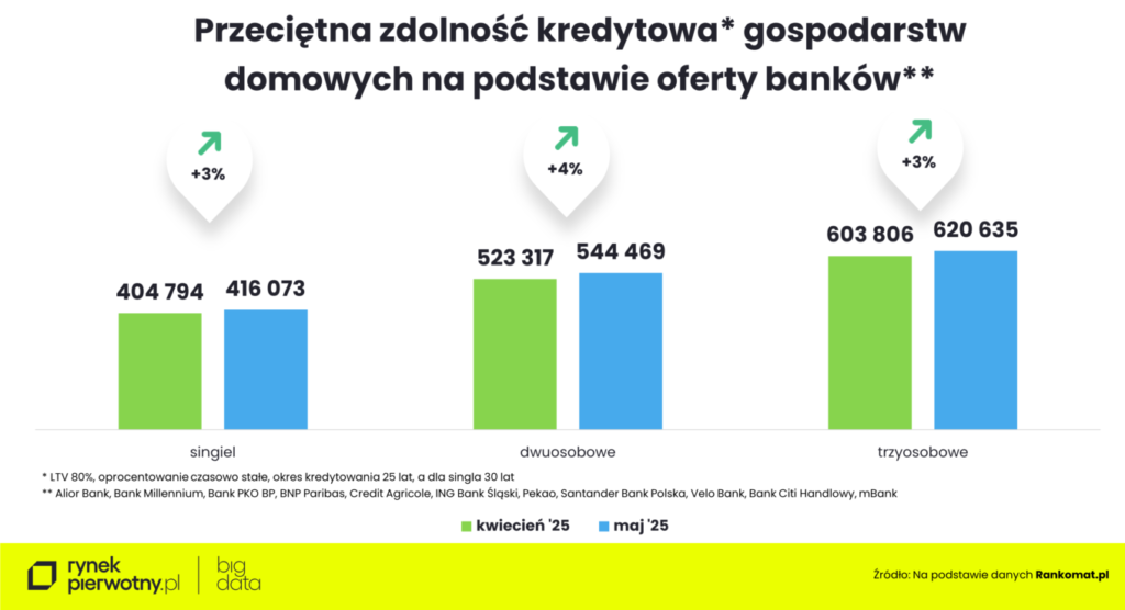 Jak wynika z analizy Rankomat.pl, nasza przykładowa singielka i singiel mogli w maju liczyć na średnio ok. 416,1 tys. zł kredytu na zakup mieszkania. To kwota o blisko 11,3 tys. zł większa niż miesiąc wcześniej i o 38,1 tys. zł większa niż w styczniu. Z kolei przeciętna zdolność kredytowa bezdzietnej pary wzrosła w maju do ok. 544,5 tys. zł (o 21,2 tys. zł w porównaniu z kwietniem), natomiast pary z dzieckiem – do ok. 620,6 tys. zł (o 16,8 tys. zł).