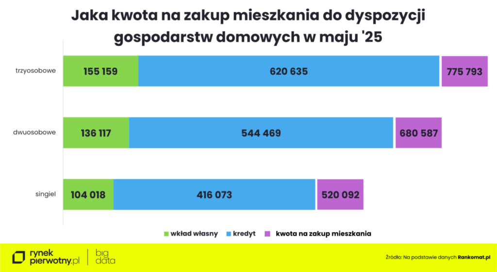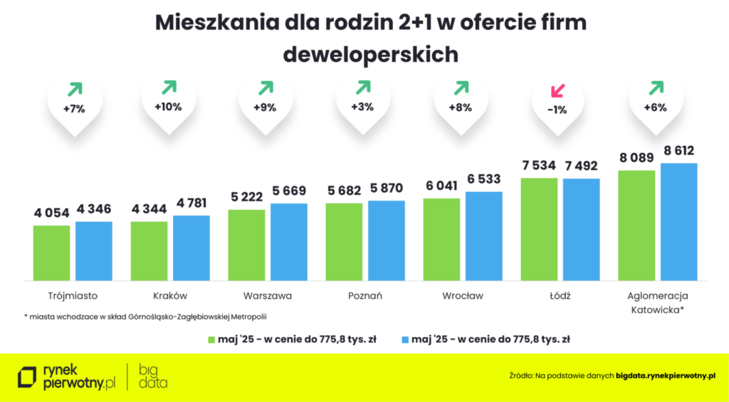 Mając do dyspozycji 775,8 tys. zł niemal we wszystkich metropoliach w zasięgu były nawet mieszkania czteropokojowe. Wyjątkiem był Kraków (zaledwie 23 takich mieszkań) i Warszawa (34). Najwięcej tak dużych metraży było w maju w Górnośląsko-Zagłębiowskiej Metropolii (573 lokali z ujawnioną ceną) i Łodzi (354). Wciąż można je było znaleźć w ofercie deweloperów w Poznaniu (112 mieszkań), Wrocławiu (153) i Trójmieście (140).