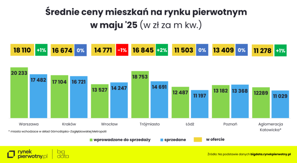 I dodaje, że w maju z taką sytuacją mieliśmy do czynienia w Warszawie, gdzie średnia cena metra kwadratowego mieszkań wprowadzonych na rynek przekraczała 20,2 tys. zł, a także w Trójmieście (blisko 18,8 tys. zł) i Górnośląsko-Zagłębiowskiej Metropolii (ok. 12,3 tys. zł).