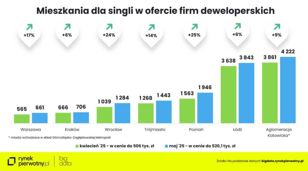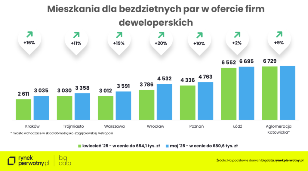 Także bezdzietne pary najpewniej ucieszy wiadomość, że w maju zwiększył im się wybór mieszkań w porównaniu z kwietniem. Największy wzrost liczby lokali w ofercie – o blisko 750 – odnotowaliśmy we Wrocławiu. Pod koniec maja było ich tam ok. 4,5 tys. (+20%). O ponad 620 mieszkań z ceną poniżej 680,61 tys. zł zwiększyła się oferta firm deweloperskich w Górnośląsko-Zagłębiowskiej Metropolii (do ok. 7,4 tys.), o blisko 580 – w Warszawie (do ok. 3,6 tys.), o ponad 420 – w Krakowie i Poznaniu (do odpowiednio ok. 3 tys. i niespełna 4,8 tys.), o niespełna 330 – w Trójmieście (do ok. 3,4 tys.) i niespełna 150 – w Łodzi (do ok. 6,7 tys.).
