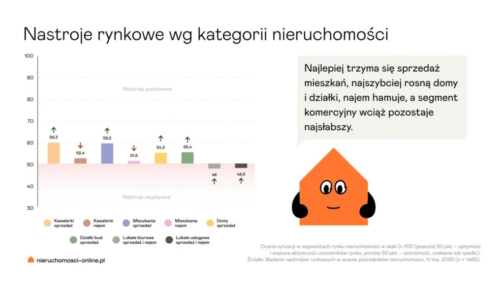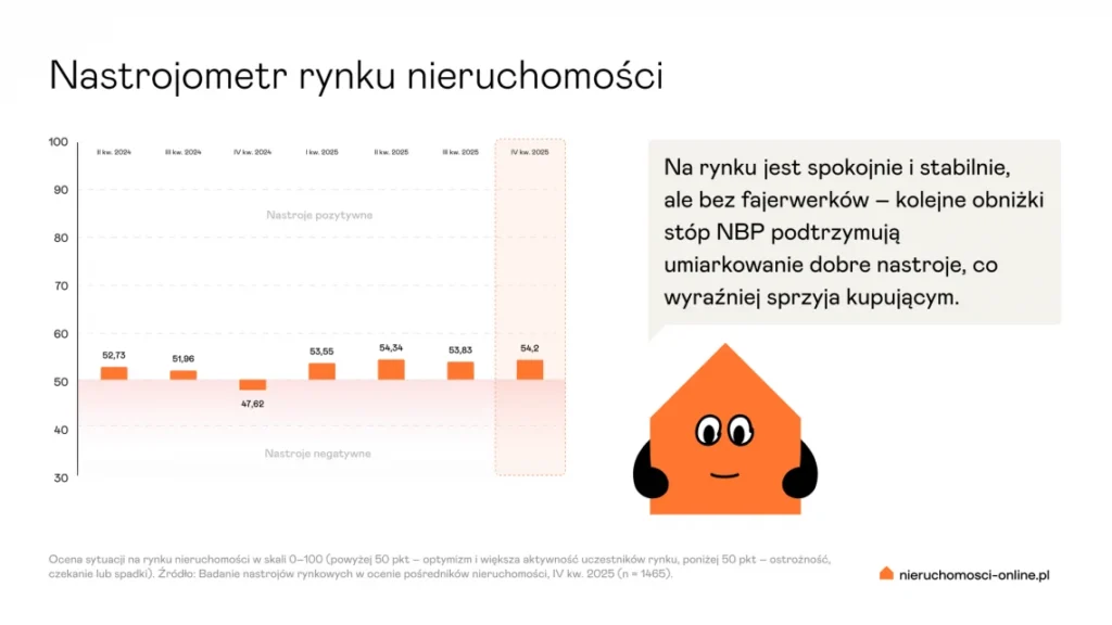 Według agentów nieruchomości w 2026 stabilizacja rynku nadal będzie trwać. Pozytywne nastroje zaznaczają się najbardziej przy sprzedaży działek budowlanych, większych mieszkań i domów, natomiast pogorszenie dotyczy głównie najmu.