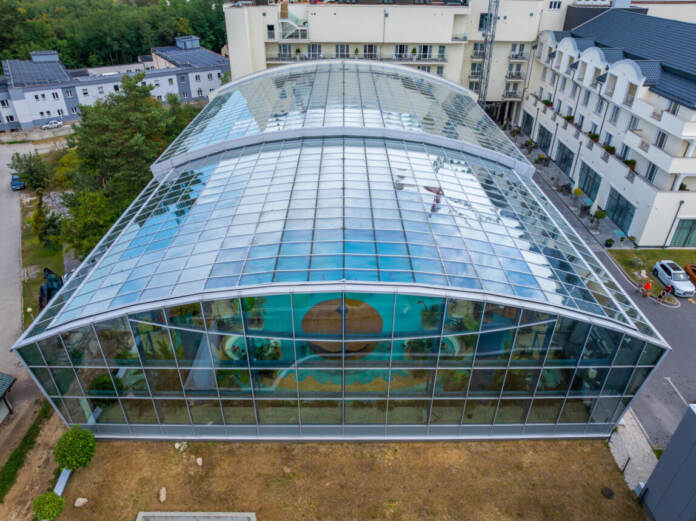 Tak duża powierzchnia przeszkleń nie pełni wyłącznie funkcji estetycznej. Szklany dach zapewnia intensywne doświetlenie światłem dziennym, współtworząc atmosferę przestrzeni rekreacyjnej, która daje użytkownikom poczucie lekkości, otwartości i bliskości natury. W sezonie basenowym nabiera to szczególnego znaczenia – kontakt ze światłem i niebem staje się integralną częścią doświadczenia miejsca.