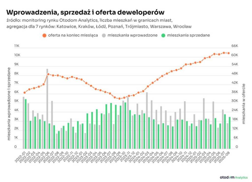 Mimo lekkiego ograniczenia podaży w sierpniu, liczba mieszkań w ofercie utrzymuje się na wysokim poziomie. Na koniec miesiąca na siedmiu rynkach deweloperskich dostępnych było 62,5 tys. mieszkań, co stanowi minimalny spadek miesiąc do miesiąca (-0,5%), ale wciąż o 22% więcej niż przed rokiem. Co ważne, liczba mieszkań zarezerwowanych wzrosła o 4% i ten zasób łącznie z ofertą mieszkań w sprzedaży tworzy rekordową i stabilną pulę pozwalającą na wzrost sprzedaży.
