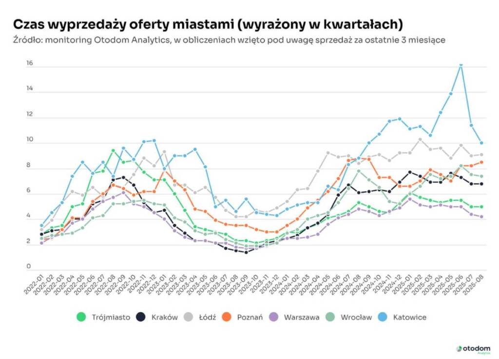 Wraz ze wzrostem skali budownictwa rynki lokalne kształtowane są przez coraz bardziej lokalne czynniki i tendencje. Dlatego oceny oparte na danych zagregowanych muszą być coraz częściej uzupełniane analizami szczegółowych wyników i statystyk opisujących rynek konkretnego miasta. Po sierpniu rynkiem wymagającym odrębnego komentarza okazał się Poznań, gdzie czas wyprzedaży oferty wydłużył się, mimo że sprzedaż była dobra a oferta niższa niż na koniec lipca. Analiza danych tamtejszego rynku wskazuje, że zmiana wskaźnika ma charakter statystyczny a nie rynkowy i wynika z metodologii przyjętej do agregacji danych sprzedażowych. Z kolei w Łodzi wydłużenie czasu sprzedaży wynika z powrotu wcześniej zarezerwowanych lokali do oferty.