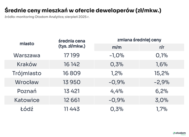 Ceny na rynku wtórnym pozostały względnie stabilne. Największe wzrosty nastąpiły w Trójmieście (+2,1% m/m), spadki zaś w Katowicach (-1,0%). Sierpień potwierdził, że rynek wtórny wchodzi w fazę równowagi: niska podaż, mocny popyt, ale coraz dłuższy czas ekspozycji ofert (+3% m/m), który pokazuje, że rozbieżności między oczekiwaniami sprzedających a możliwościami nabywców utrudniają finalizowanie transakcji.