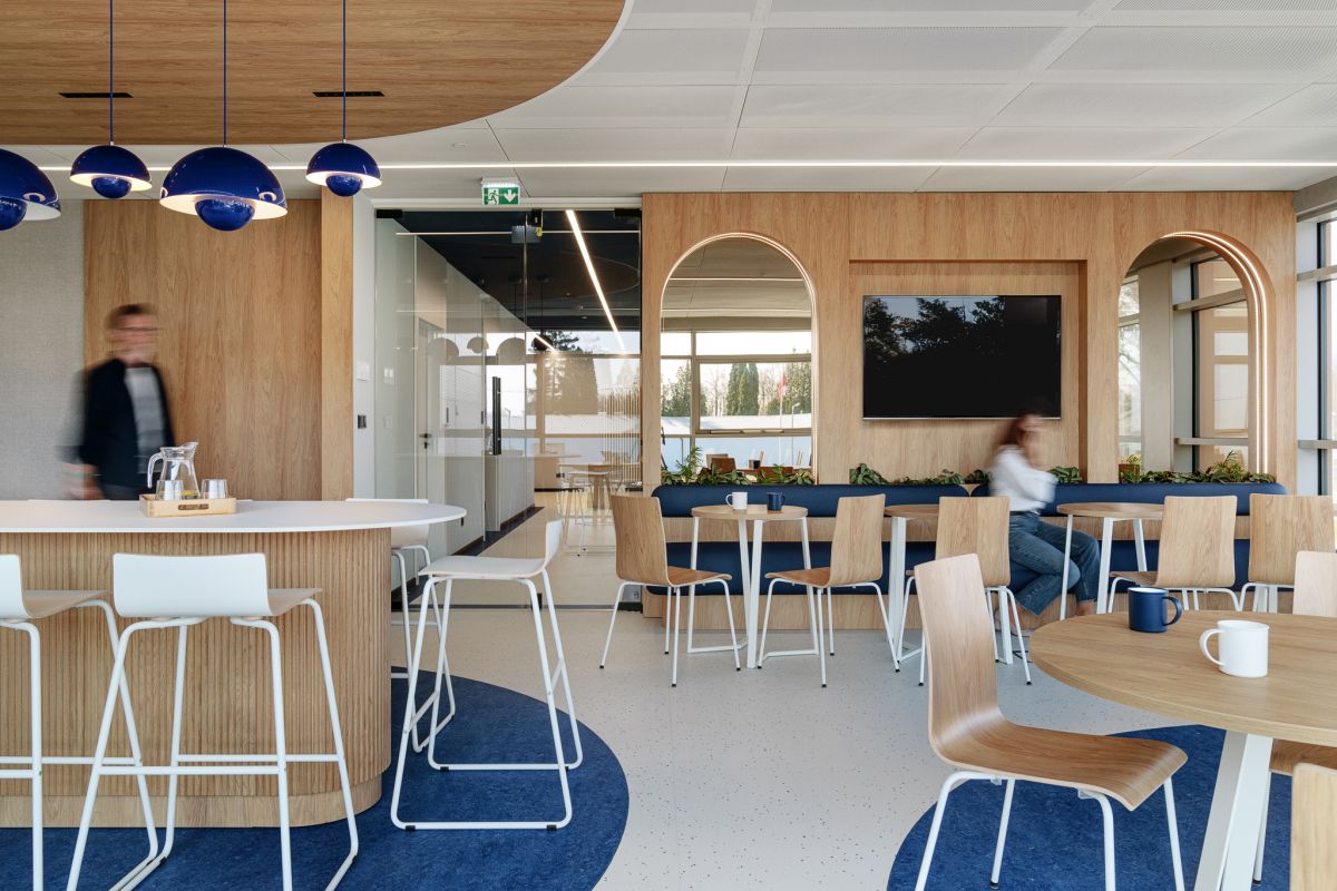 Stonowane, naturalne barwy dają poczucie spokoju i tworzą środowisko sprzyjające wyciszeniu i skupieniu. Wprowadzenie naturalnej roślinności poprawia jakość powietrza i działa kojąco na użytkowników. Ważnym elementem tej filozofii jest również oświetlenie typu HCL (Human Centric Lighting).