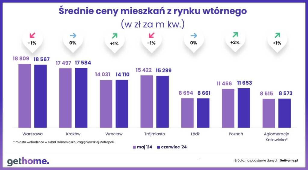 W Warszawie czerwiec przyniósł bardzo długo wyczekiwany przez wielu spadek średniej ceny metra kwadratowego mieszkań na rynku wtórnym. Także w innych metropoliach są już widoczne symptomy cenowej stabilizacji – wynika z danych portalu GetHome.pl.