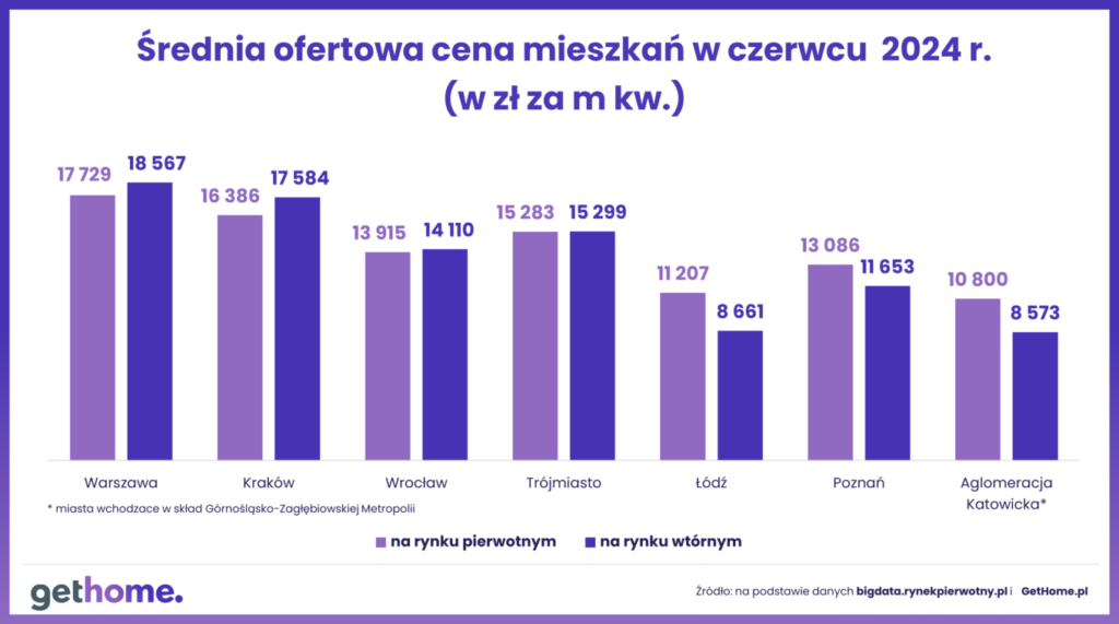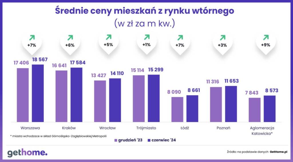 Podsumowując pierwsze półrocze 2024 roku największa dynamika cen miała miejsce w Górnośląsko-Zagłębiowskiej Metropolii, w której metr lokalu z drugiej ręki wzrósł aż o ponad 9%. Wg danych GetHome.pl średnia cena metra od początku na tym rynku urosła o ok. 800 zł. Na drugim i trzecim miejscu znalazły się Łódź i Warszawa, w których ceny od początku roku wzrosły o ok. 7%. Kraków i Wrocław zanotowały zmiany rzędu 6% i 5%. Najmniejszą zmianę analitycy GetHome.pl odnotowali w Trójmieście (+1%) oraz Poznaniu (+3%).