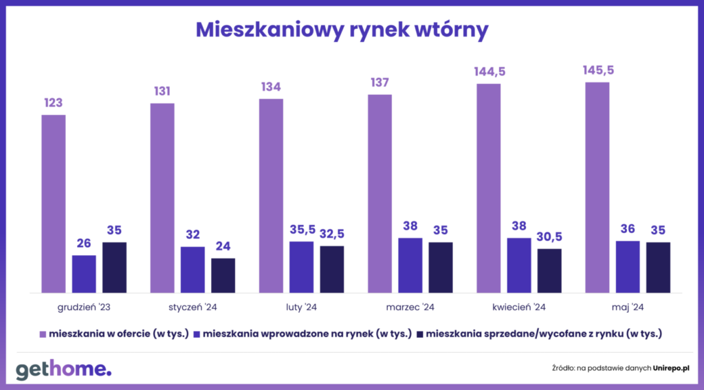Takie wrażenie może wynikać z faktu, że od momentu wygaśnięcia programu „Bezpieczny Kredyt 2%” zwiększa się oferta lokali na rynku wtórnym. Świadczą o tym dane Unirepo.pl, który monitoruje 52 największe portale ogłoszeniowe. Pod koniec maja w całym kraju było w nich zamieszczonych ok. 145,5 tys. unikalnych ofert mieszkań. Od grudnia ubiegłego roku ich liczba wzrosła więc o ponad 18%. Nie świadczy to jednak o gwałtownie malejącym z każdym miesiącem zainteresowaniu ze strony kupujących. Po prostu mieszkań, które sprzedający wprowadzali na rynek było więcej niż chętnych na nie.