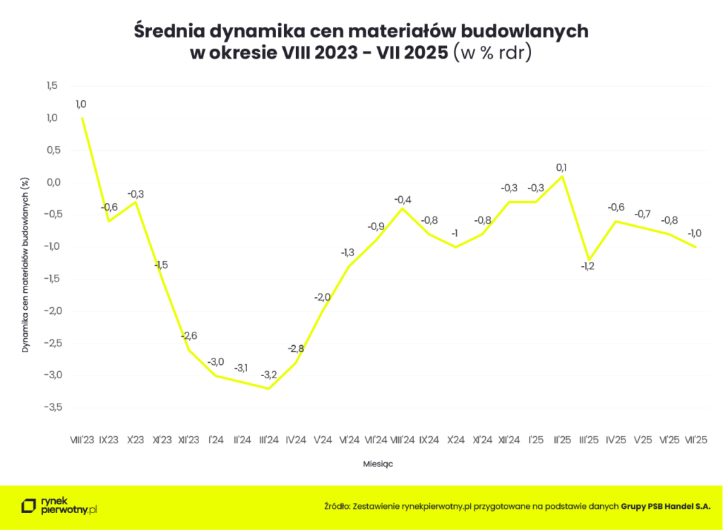 Grupa PSB w swojej najnowszej informacji o zmianach cen materiałów budowlanych w lipcu 2025 r. po raz pierwszy od dosyć dawna zakomunikowała ożywienie popytu na większość grup asortymentowych. Prawdopodobnie nie jest kwestią przypadku fakt, że wzrost sprzedaży zbiegł się w czasie z wyraźnym odbiciem statystyk GUS budownictwa mieszkaniowego. Ich mocno utrwalony spadkowy trend w lipcu uległ wyraźnemu odwróceniu, co w istotnym stopniu oddaliło narastające widmo ryzyka załamania koniunktury inwestycyjnej pierwotnego segmentu rodzimej mieszkaniówki. Co ciekawe, do znacznej poprawy danych przyczynili się zarówno inwestorzy indywidualni jak i deweloperzy, choć ci ostatni w wyraźnie większym stopniu. Najsilniejsze odreagowanie tendencji malejącej stało się udziałem nowych deweloperskich pozwoleń na budowę, jednak równie optymistycznie zaprezentowały się dane najbardziej istotne z punktu widzenia stanu bieżącej koniunktury, czyli dotyczące mieszkań, których budowę rozpoczęto. Wygląda na to, że obawy budowniczych mieszkań o perspektywy rozwoju koniunktury sprzedażowej nowych mieszkań ustąpiły mobilizacji inwestycyjnej przed oczekiwanym jesiennym wzrostem aktywności popytowej rynku pierwotnego.