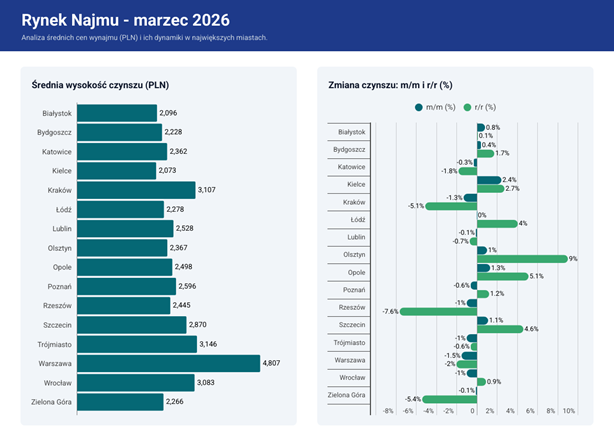 Natomiast w ujęciu rocznym na rynkowych liderów wyrastają Olsztyn oraz Opole, gdzie przeciętne stawki ofertowe skoczyły odpowiednio o 9% i 5,1%. Mimo tak wyraźnej dynamiki, oba miasta wciąż pozostają znacznie poniżej średniej dla 18 analizowanych rynków. Nieco głębiej do portfela muszą sięgnąć jednak mieszkańcy Opola, gdzie koszt najmu wynosi 2,5 tys. zł miesięcznie.