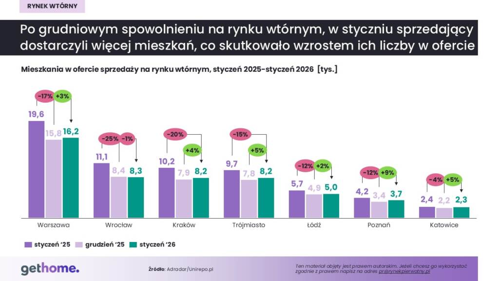 W Warszawie liczba ofert wzrosła w styczniu z 15,8 tys. do 16,2 tys., czyli o 3%. Podobna sytuacja miała miejsce w większości pozostałych metropolii. Według Adradaru w styczniu liczba unikalnych ofert mieszkań na rynku wtórnym zwiększyła się o 2% w Łodzi (do 5 tys. lokali), o 4% w Krakowie (do 8,2 tys.), o 5% w Trójmieście (do 8,2 tys.) i Katowicach (do 2,3 tys.) oraz o 9% w Poznaniu (do 3,7 tys.). Jedynie we Wrocławiu oferta skurczyła się symbolicznie – o 1% do 8,3 tys. mieszkań. Jednocześnie, jak podkreśla Marek Wielgo, we wszystkich metropoliach liczba ofert na rynku wtórnym pozostaje niższa niż przed rokiem. We Wrocławiu spadek ten sięga 25%.