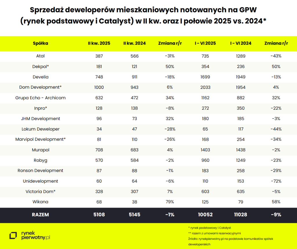 Notowana na warszawskiej GPW stawka 15-tu deweloperów mieszkaniowych, w okresie kwiecień-czerwiec br. znalazła nabywców na 5108 lokali. Oznacza to symboliczny 1-procentowy regres w relacji rok do roku, z kolei kwartał do kwartału zanotowano wzrost rzędu niemal 5 proc. To lepsze wyniki niż szeroki rynek na 7 największych miastach ogółem, który odnotował spadek odpowiednio rok do roku na poziomie 4% i kwartał do kwartału 5%. Tymczasem wynik za pierwsze półrocze na poziomie 10052 jednostek jest wyraźnie słabszy w relacji rok do roku, notując 9-procentowy spadek, podczas gdy rynek – spadł o 12%. Tego typu statystyki oznaczają, że rynek próbuje poddać się sprzedażowej stabilizacji, z której duzi deweloperzy wychodzą z lepszymi wynikami niż mniejsze podmioty.