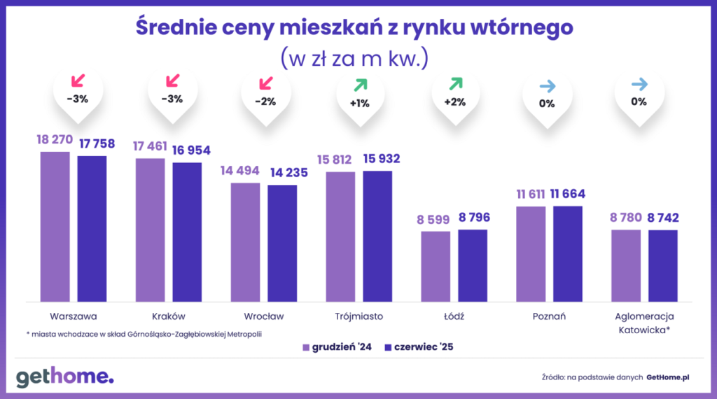 Z danych portalu GetHome.pl wynika, że w Warszawie (ok. 17,8 tys. zł/m kw.) i Krakowie (blisko 17 tys. zł/m kw.) średnia była w czerwcu o 3% niższa niż w grudniu ubiegłego roku, a we Wrocławiu (14,2 tys. zł/m kw.) – o 2%. Poziom z grudnia utrzymała ona w Poznaniu (ok. 11,7 tys. zł/m kw.) i w miastach Górnośląsko-Zagłębiowskiej Metropolii (ok. 8,7 tys. zł/m kw.). Natomiast w Trójmieście (15,9 tys. zł/m kw.) średnia cena mieszkań z drugiej ręki w przeliczeniu na metr kwadratowy wzrosła o 1%.