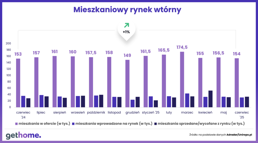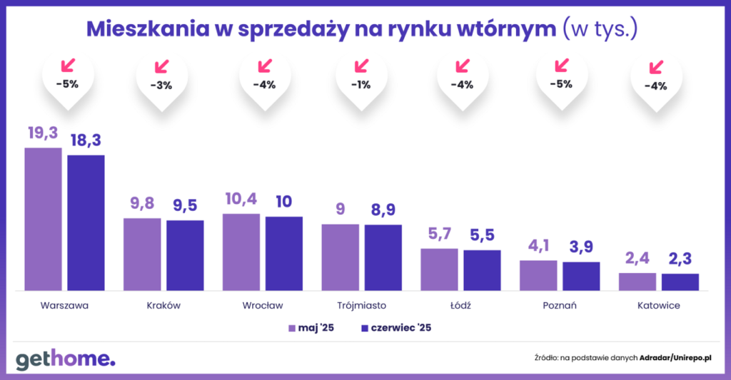 Po majowej stabilizacji oferty na rynku wtórnym, czerwiec przyniósł jej spadek we wszystkich metropoliach. Najbardziej – o 5% – skurczyła się ona Warszawie (do 18,3 tys. lokali) i Poznaniu (do 3,9 tys.). O 4% mniej mieszkań niż w maju było na rynku wtórnym we Wrocławiu (10 tys. lokali), Łodzi (5,5 tys.) i Katowicach (2,3 tys.), o 3% – Krakowie (9,5 tys.) i o 1% – w Trójmieście (8,9 tys.).