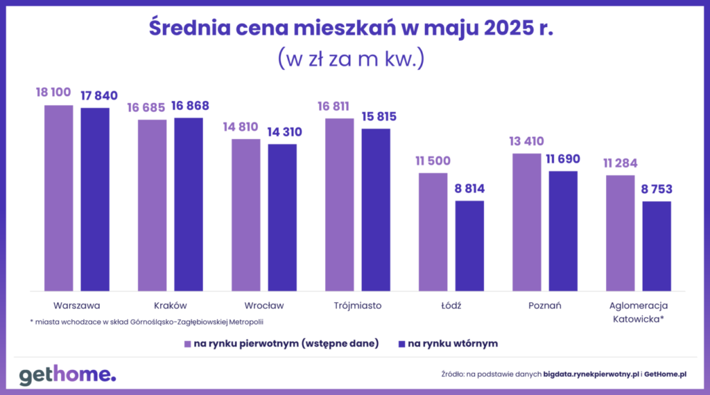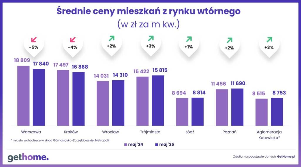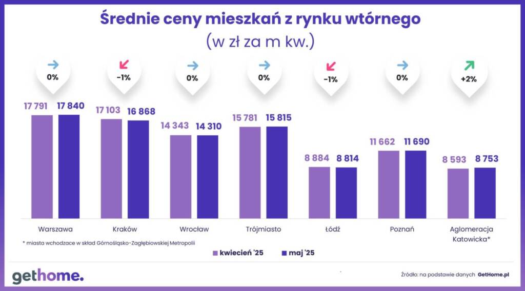Tymczasem – jak wynika z danych portalu GetHome.pl – w maju tylko w miastach Górnośląsko-Zagłębiowskiej Metropolii średnia cena metra kwadratowego mieszkań oferowanych na rynku wtórnym poszła w górę, i to aż o 2%, Natomiast w Łodzi spadła o 1%. Podobnie w Krakowie, gdzie średnia zeszła poniżej pułapu 17 tys. zł (do niespełna 16,9 tys. zł/m kw.). Poziom z kwietnia utrzymała zaś we Wrocławiu (ok. 14,3 tys. zł/m kw.), Warszawie (ok. 17,8 tys. zł/m kw.), Trójmieście (ok. 15,8 tys. zł/m kw.) i Poznaniu (ok. 11,7 tys. zł/m kw.).