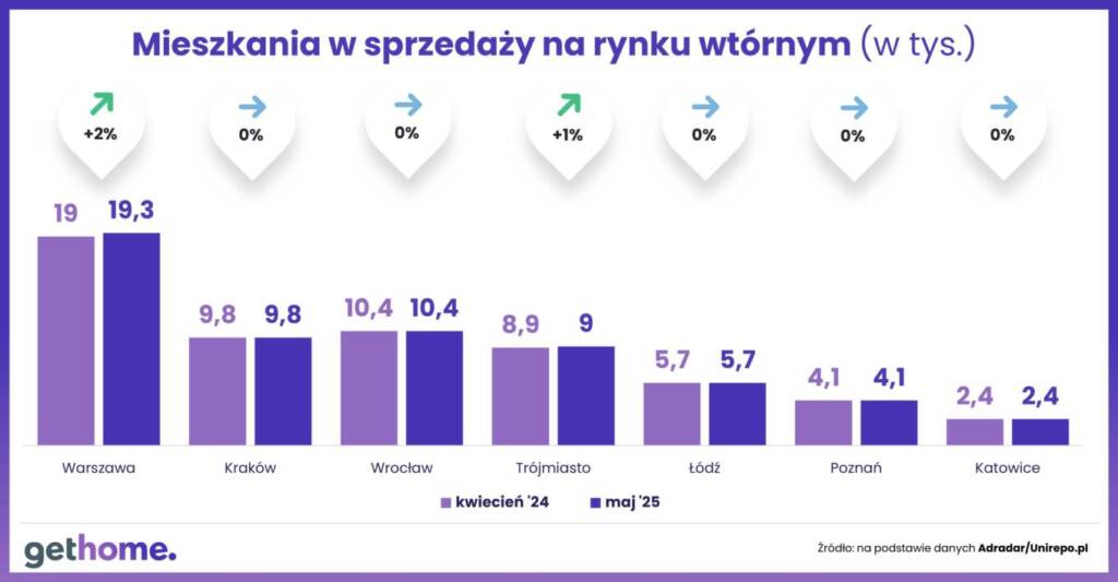 Po kwietniowym spadku oferty mieszkań na rynku wtórnym maj przyniósł jej stabilizację w niemal wszystkich metropoliach. Jak wynika z danych przeszukiwarki portali nieruchomości Adradar, oferta zwiększyła się tylko w Warszawie – o 2% (do 19,3 tys. lokali) oraz w Trójmieście – o 1% (do 9 tys.). Tyle samo mieszkań co w kwietniu było na rynku wtórnym w Krakowie (9,8 tys. lokali), Wrocławiu (10,4 tys.), Łodzi (5,7 tys.), Poznaniu (4,1 tys.) i Katowicach (2,4 tys.).