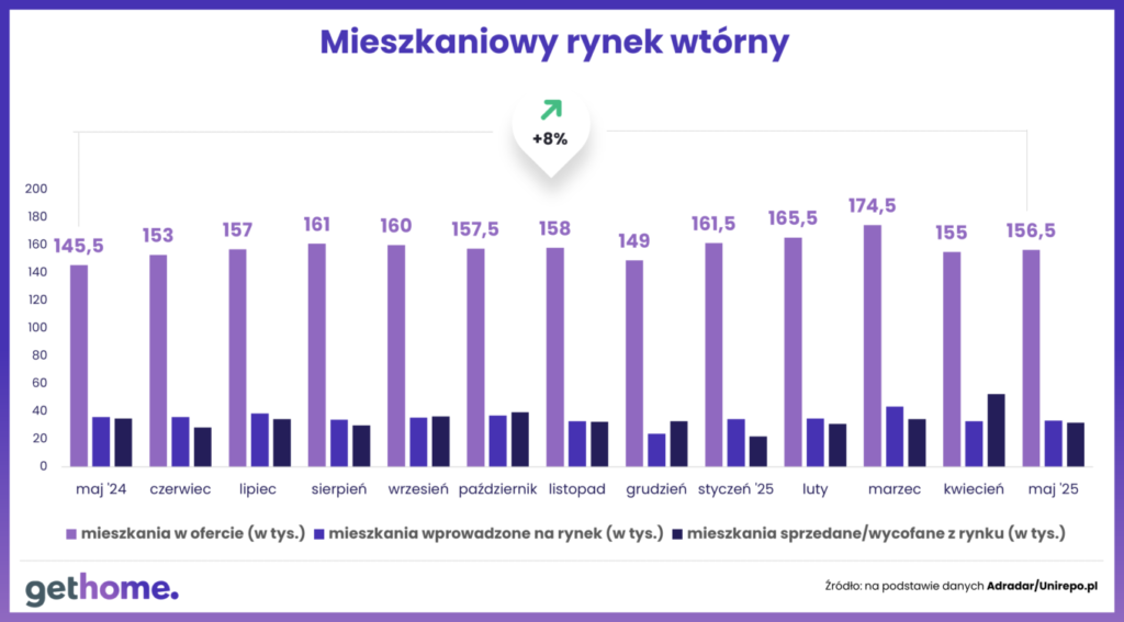 Z danych Adradar wynika, że pod koniec maja w całym kraju było zamieszczonych ok. 156,5 tys. unikalnych ofert sprzedaży mieszkań, czyli o 1% więcej niż miesiąc wcześniej. Co ważne, w maju na rynku wtórnym pojawiło się 33,5 tys. nowych unikalnych ofert, czyli o 2% więcej niż w kwietniu. Z drugiej strony wycofano ich tylko 32 tys., czyli o 39% mniej.