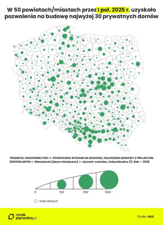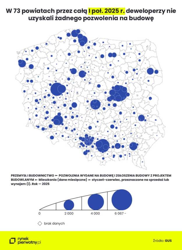 Po podsumowaniu danych GUS za okres od stycznia do czerwca 2025 r. widzimy aż 73 deweloperskie białe plamy, czyli powiaty z zerową liczbą pozwoleń na domy i lokale uzyskanych przez deweloperów. Takie powiaty znajdziemy nie tylko na wschodzie kraju. Przykładem może być pow. pyrzycki (woj. zachodniopomorskie), pow. międzyrzecki (woj. lubuskie) oraz pow. turecki (woj. wielkopolskie). Z drugiej strony, na terenie jedynie dwudziestu wiodących powiatów i miast na prawach powiatu, powstanie co drugi dom i lokal mieszkalny na sprzedaż z nowym pozwoleniem (otrzymanym w I poł. 2025 r.).