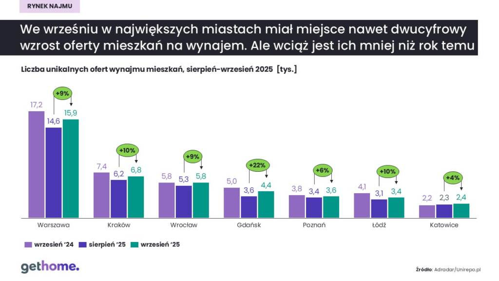 Co ciekawe, w największych miastach akademickich Adradar odnotował we wrześniu nawet dwucyfrowy wzrost liczby oferowanych mieszkań na wynajem. Aż o 22% wzrosła ich oferta w Gdańsku (do 4,4 tys. lokali), o 10% – w Krakowie (do 6,8 tys.) i Łodzi (do 3,4 tys.), o 9% – w Warszawie (do 15,9 tys.) i Wrocławiu (do 5,8 tys.), o 6% – w Poznaniu (do 3,6 tys.) i o 4% – w Katowicach (do 2,4 tys. lokali). Warto zauważyć, że w tym roku fenomenem jest Gdańsk. Z danych portalu Adradar wynika, że liczba mieszkań na wynajem oferowanych w portalach ogłoszeniowych wzrosła w trzecim kwartale tego roku aż o ponad 90%! Z drugiej strony wciąż jest ich mniej niż przed rokiem. Podobnie zresztą, jak w pozostałych metropoliach z wyjątkiem Katowic.
