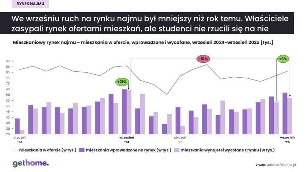 – Wielu właścicieli mieszkań czekało najpewniej z utęsknieniem na nadejście września, bo wówczas umowy finalizują dziesiątki tysięcy studentów. Tymczasem oferta mieszkań wzrosła, a ci nie rzucili się na nie aż tak bardzo. W efekcie czynsze utrzymały poziom z sierpnia lub nawet spadły – mówi Marek Wielgo, ekspert portalu GetHome.pl.